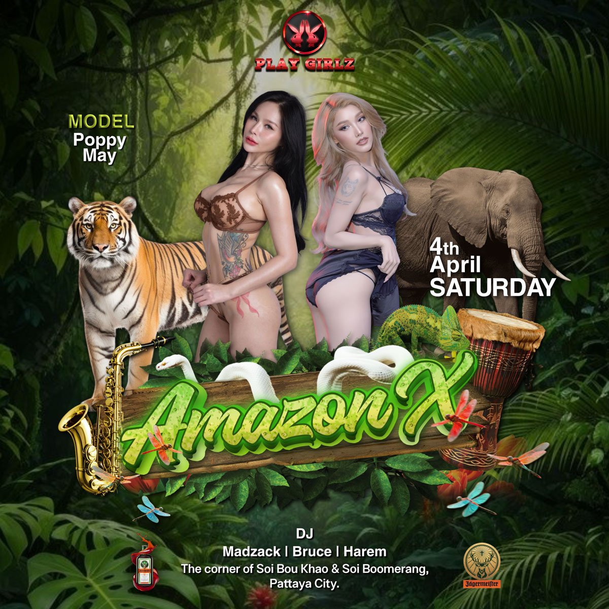 Step into the untamed Amazon β Playgirlz style! β’πΏ An Amazon Fantasy Like No Other: Bangkokβs top models: Tangmo & Poppy π Live drummers & saxophonists electrifying the jungle π·π₯ Exotic snakes, lizards, and wild animals π β’Over 60 Playgirlz Models in full Amazon-inspired outfits π₯ β’πΆ Beats of the Jungle: Afro House & House all night with DJ Madzak & DJ Naru, powered by JΓ€germeister β’β¨ VIP Experience: Secure your Private VIP or Floor Table via our website or DM on WhatsApp/social media. Spots are limited!